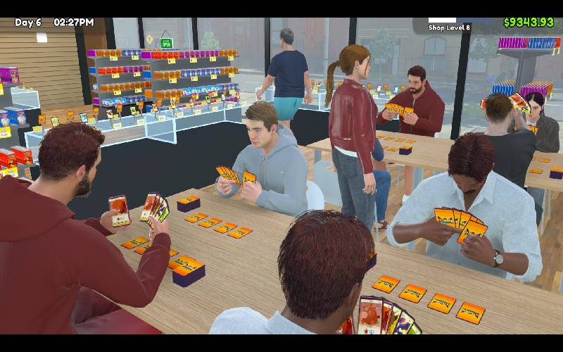 Dirige tu propia tienda de cartas coleccionables estableciendo la tienda, encontrando cartas raras en sobres de refuerzo y organizando juegos de cartas. Equilibra el inventario y mantén un ambiente limpio para mantener a los clientes contentos y asegurar el éxito de tu tienda.