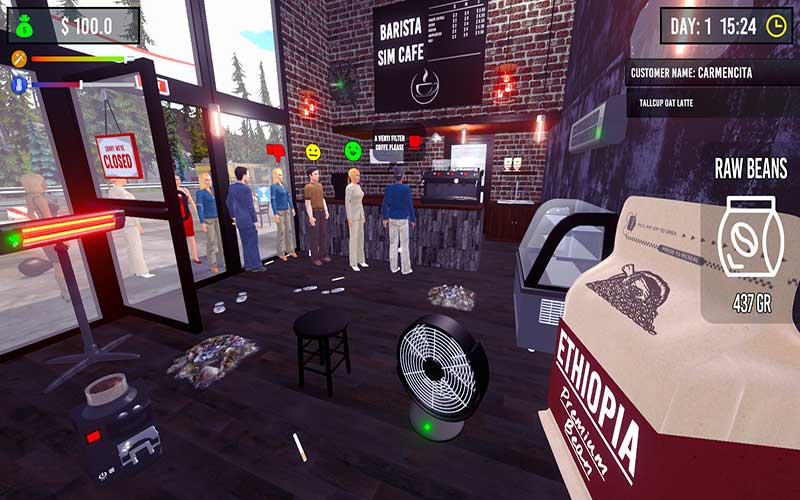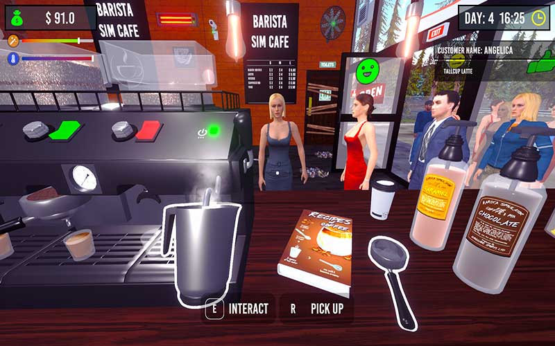 Con Barista Simulator podrá practicar la elaboración de una amplia gama de cafés, como espresso, latte, cappuccino e incluso su propia mezcla personalizada. Juegas el papel de un barista mientras diriges tu negocio de café y preparas las bebidas que prefieren tus clientes. Tú decides cómo tratar a tus clientes.