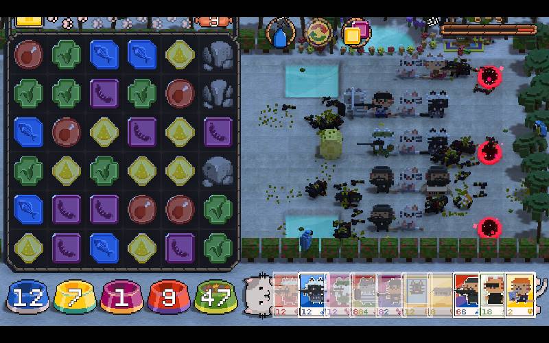 • Sin embargo, no solo tendrás que preocuparte por el aspecto de defensa de torres, conecta gemas en el campo de recursos para recibir moneda que puedes usar para comprar tus soldados/gatos torres. Intercambia y combina gatos en el campo de batalla para crear torres mejoradas, dándoles ataques más poderosos.