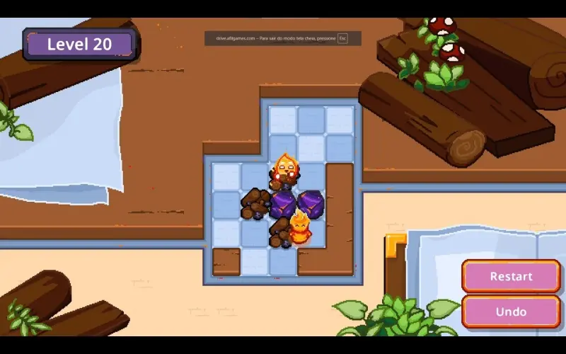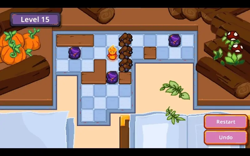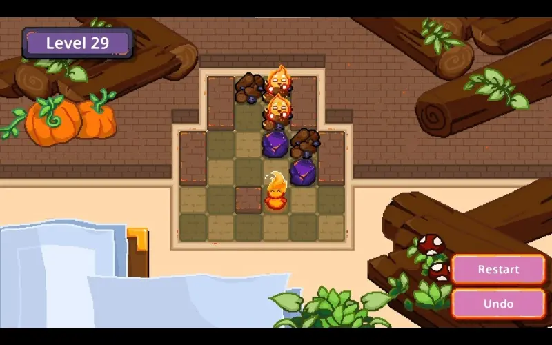 Un pequeño espíritu de fuego se desplaza casilla por casilla dentro de una acogedora chimenea con estilo pixel-art. Su misión es empujar trozos de carbón para reactivar las hogueras dormidas. Apaga todas las llamas para llenar de calidez y encanto cada rincón del hogar.