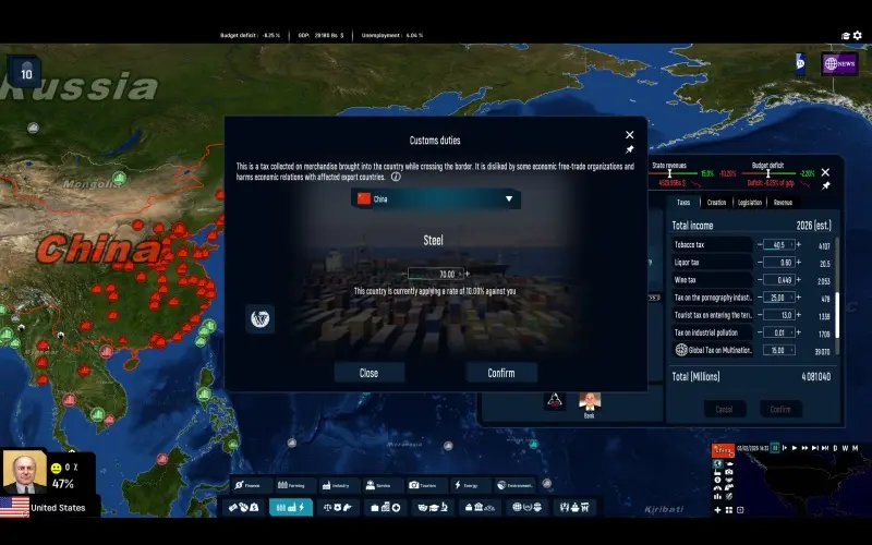 El mundo está en tus manos mientras diriges cualquier nación, enfrentando desafíos económicos, militares y sociales. Puedes liderar como jefe de estado o como oposición. Estrategia, previsión y gestión cuidadosa moldean el futuro de tu país.