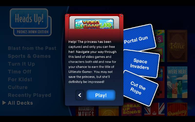 ¡Olvida tu teléfono y prepárate para la diversión! Heads Up Phones Down Edition lleva el clásico juego de adivinanza a la pantalla grande. Reúne a tus amigos y familiares para momentos divertidísimos mientras compites contra el tiempo para adivinar la palabra en tu cabeza basándote en pistas locas.