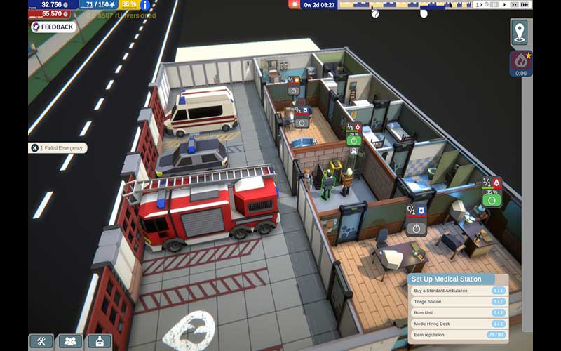 Construye, gestiona y organiza una estación con tres departamentos de emergencia que son la Policía, los Bomberos y la Ambulancia. Para cada uno de estos departamentos, debes asegurarte de que todo esté bien equilibrado con tus empleados contentos y que todo esté al día.