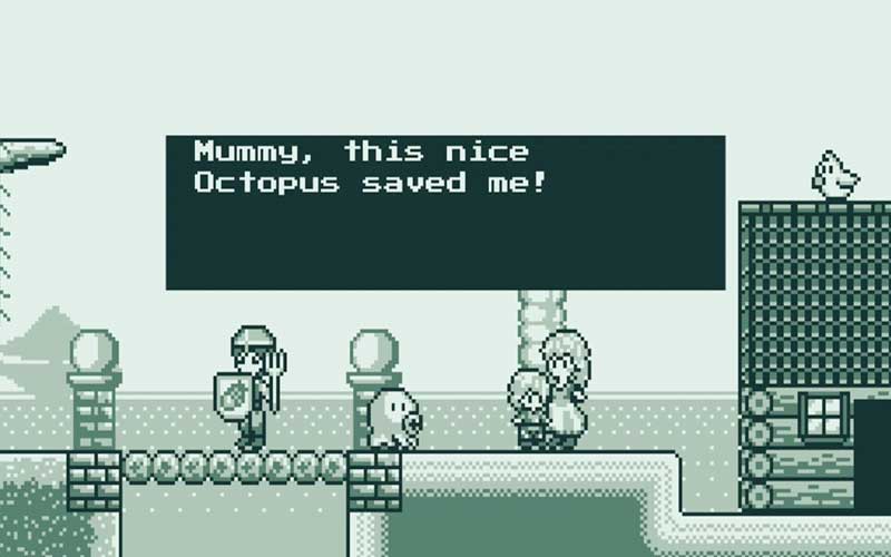 Del videojuego original de Game Boy, Save me Mr. Tako: Tasukete Tako – San es un tributo al querido sistema de videojuego portátil.