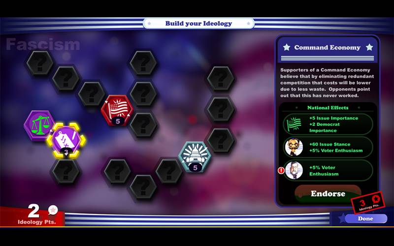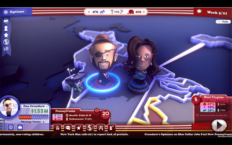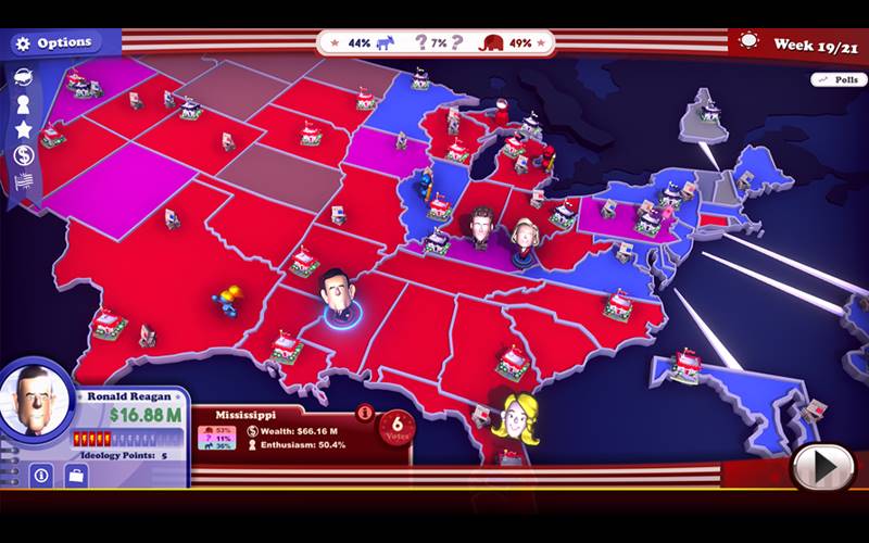 • Sumérgete en la piel de varios candidatos, cada uno con estadísticas únicas, o crea tu propio líder para la carrera hacia la Casa Blanca.
