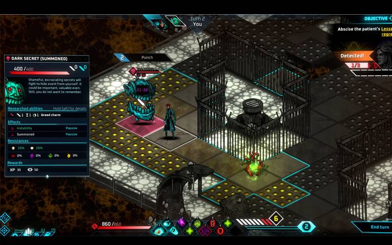 • El combate comienza con ocho puntos de acción, pero gastarlos los distribuye entre cada enemigo ¡así que ten cuidado! ¡Cuanto más actúes, más reaccionarán ellos! Pero si eres lo suficientemente decidido, eliminar a un enemigo te otorgará puntos de acción que permitirán turnos explosivos a tu favor o en tu contra. Para igualar las probabilidades, debes aprender a usar el entorno a tu favor, moviéndolos hacia explosivos cuidadosamente ubicados o charcos de veneno.